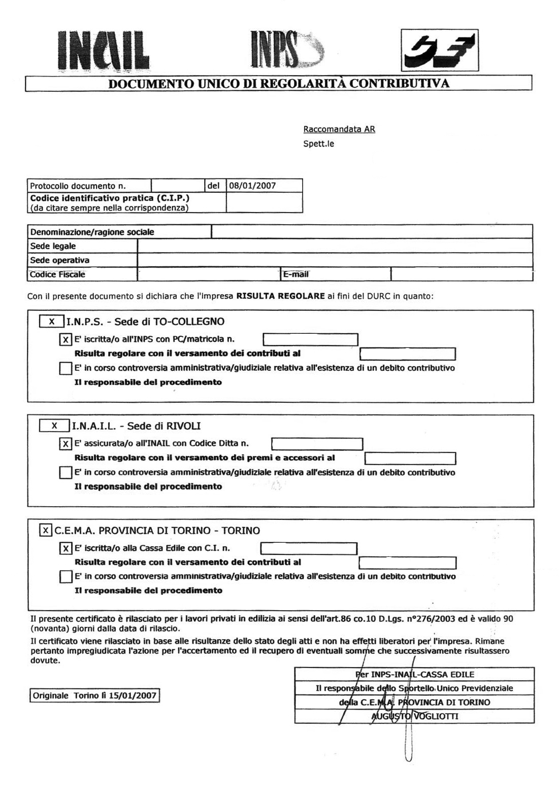La certificazione di regolarità contributiva deve essere consegnata al Proprietario o al suo Tecnico prima dell’inizio dei lavori oggetto di concessione edilizia o di DIA (denuncia inizio attività).